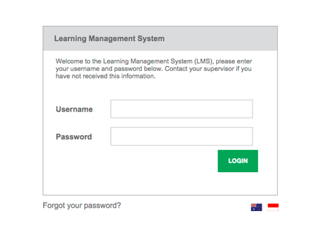 When you first launch the LMS you will be presented with the login screen. Enter your username and password you were supplied in the welcome email and click the LOGIN button.