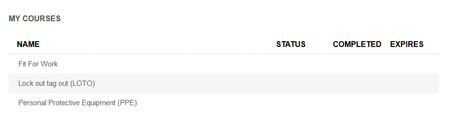 As you work through the courses your progress will be recorded and you can see your course STATUS, COMPLETED dates and the date the course EXPIRES listed beside the course name.